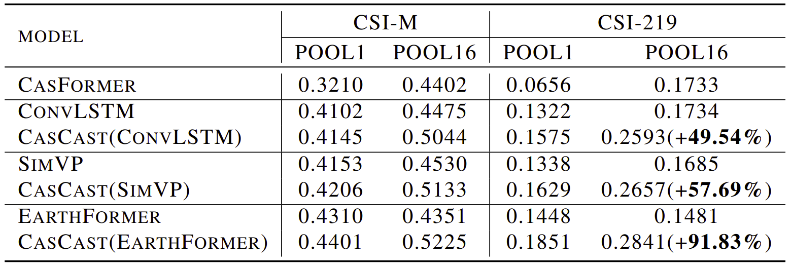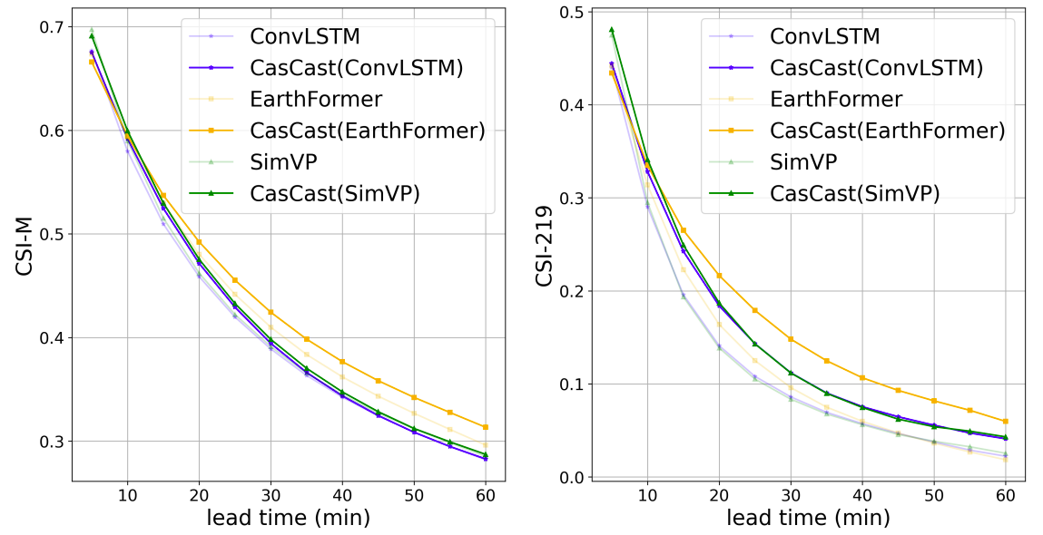 The results were that using either the probabilistic or deterministic model alone led to problems like pixel mismatches or poor predictions of small-scale patterns and extreme regional values. However results improved significantly when ConvLSTM, SimVP, and EarthFormer were used as the deterministic parts of CasCast, . The CSI-219-POOL16 metric shot up by 49.54%, 57.69%, and 91.83% with each of these models. This shows that the cascaded approach improves regional extreme-precipitation nowcasting.