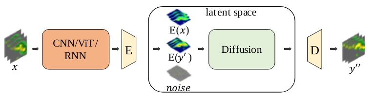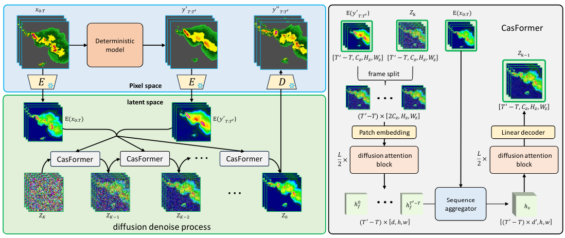 - \(z_{\text{cond}}\) represents the conditional information, including the latent representations of the initial radar observations and deterministic model outputs.