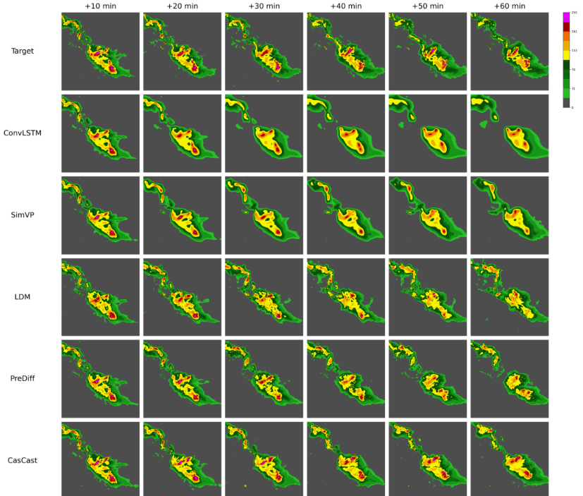 Comparisons with outputs from other models highlight CasCast’s superior performance in capturing both macro and micro-precipitation dynamics without issues like blurring or oversimplification that can be seen in other forecasting models. The results demonstrate that the model can distinguish between different precipitation intensities and spatial distributions with high fidelity.