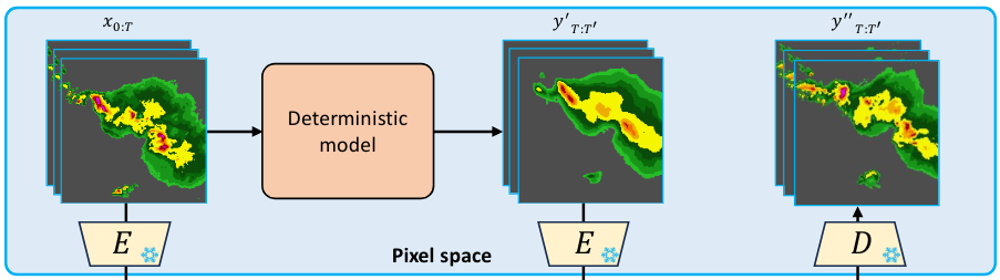 Using the output of the deterministic model, the probabilistic model generates the fine-grained details and local variations within the precipitation pattern. It aims to model the stochasticity inherent in meteorological systems, this is particularly useful for capturing the nuances of extreme weather events.